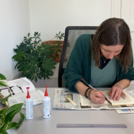 4 | Nun legen Sie die beiden Buchteile am Vorderschnitt genau übereinander. Reiben Sie den Kartonrücken und den Falz mithilfe Ihres Falzbeines und eines Trägerpapiers gut an. Lassen Sie das Buch zwischen zwei Brettern mit einem Gewicht beschwert etwa einen Tag trocknen, bevor Sie es wieder öffnen.