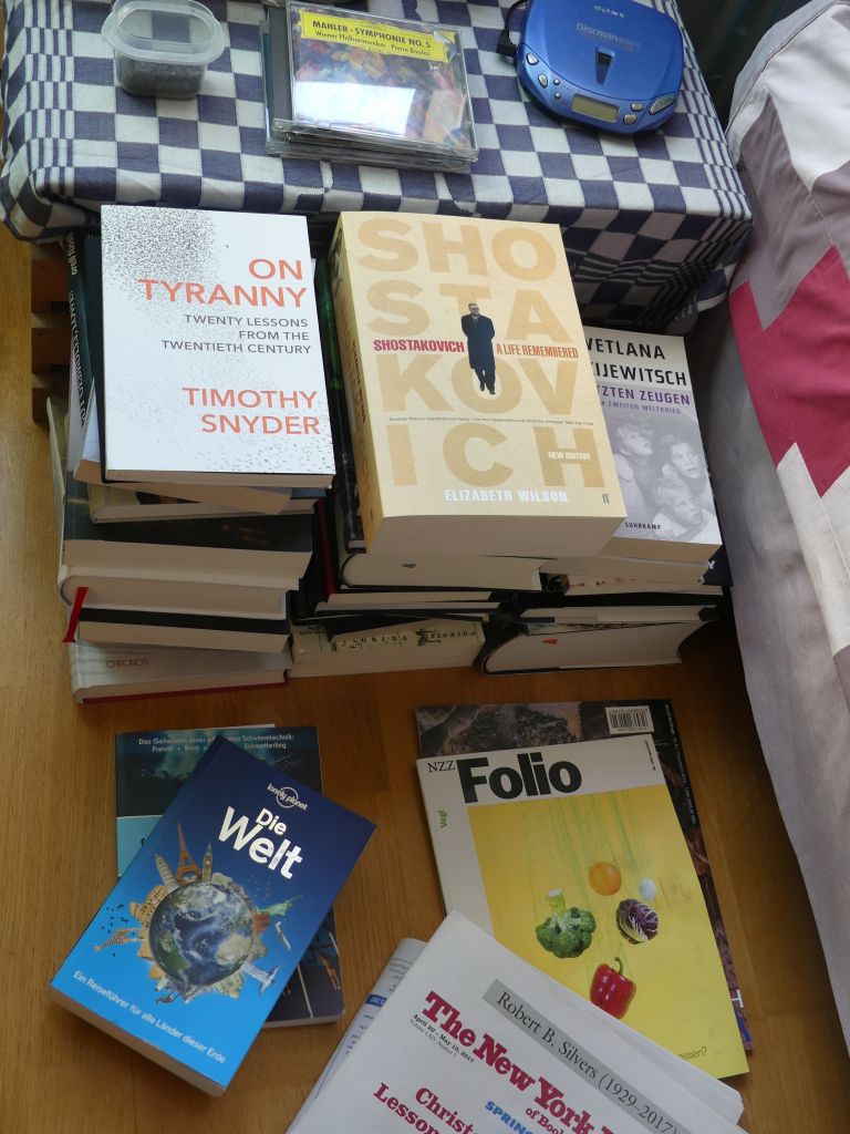 Immer furchtbar viele – ich kaufe deutlich mehr Bücher, als ich lesen kann. Deshalb versuche ich mir auch immer wieder (erfolglos) einen vorübergehenden Kaufstopp zu verordnen. Auf den Bücherstapeln liegt so allerlei; ziemlich weit oben gerade Butcher’s Crossing von John Williams, aber auch eine Biografie meines Lieblingskomponisten Dmitri Schostakowitsch, das kürzlich bei Haupt erschienene Boden-Buch, dazu einiges zur Geschichte des 20. Jahrhunderts und ab und zu etwas Philosophisches.