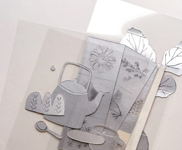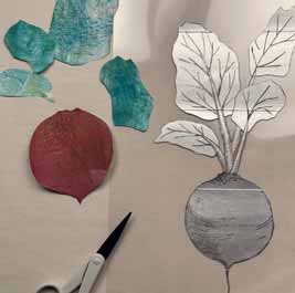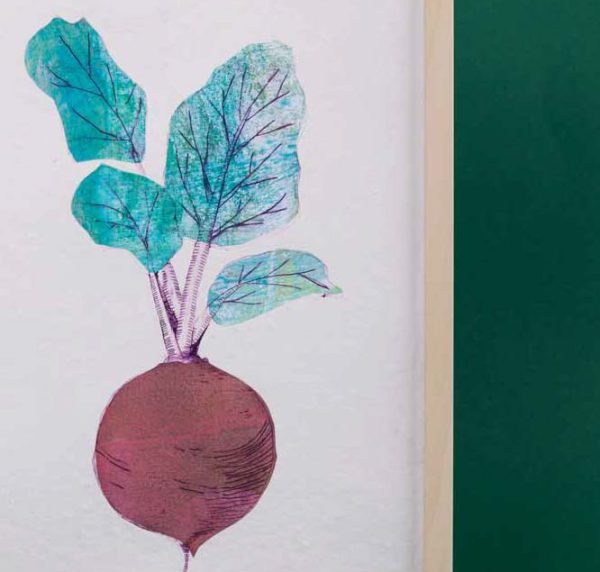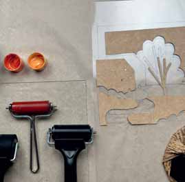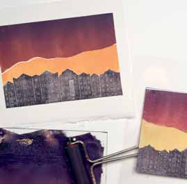 Bei der Chine-collé-Technik wird ein Stück dünnes einfarbiges oder gemustertes Papier auf die Druckplatte gelegt und beim Drucken auf das Druckpapier geklebt. Der Abzug erhält so mehr Textur. Experimentieren Sie mit verschiedenen Papieren, z. B. selbst bemalten Bogen oder Seiten aus alten Büchern oder Zeitschriften.