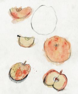 Eva (9) hat einen Apfel begonnen, der ihr nicht gefällt. Sie hat die Kontur einfach stehen lassen. Die gesamte Zeichnung ist wunderschön.
