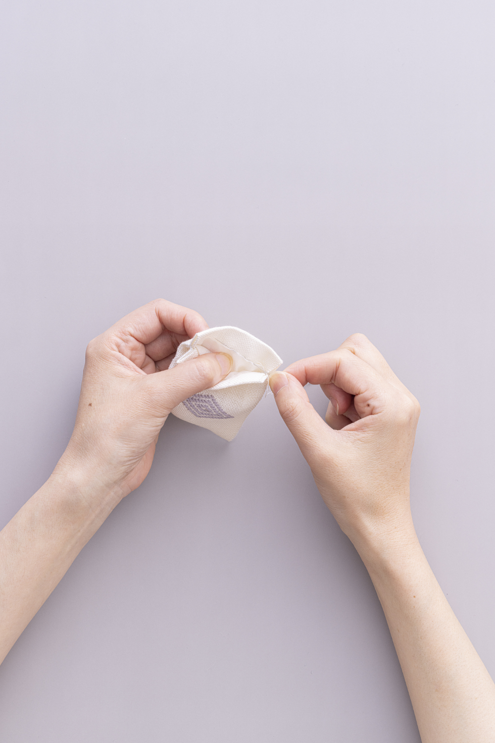 - Das Futter in das Säckchen stecken und an der Umschlagkante festnähen.