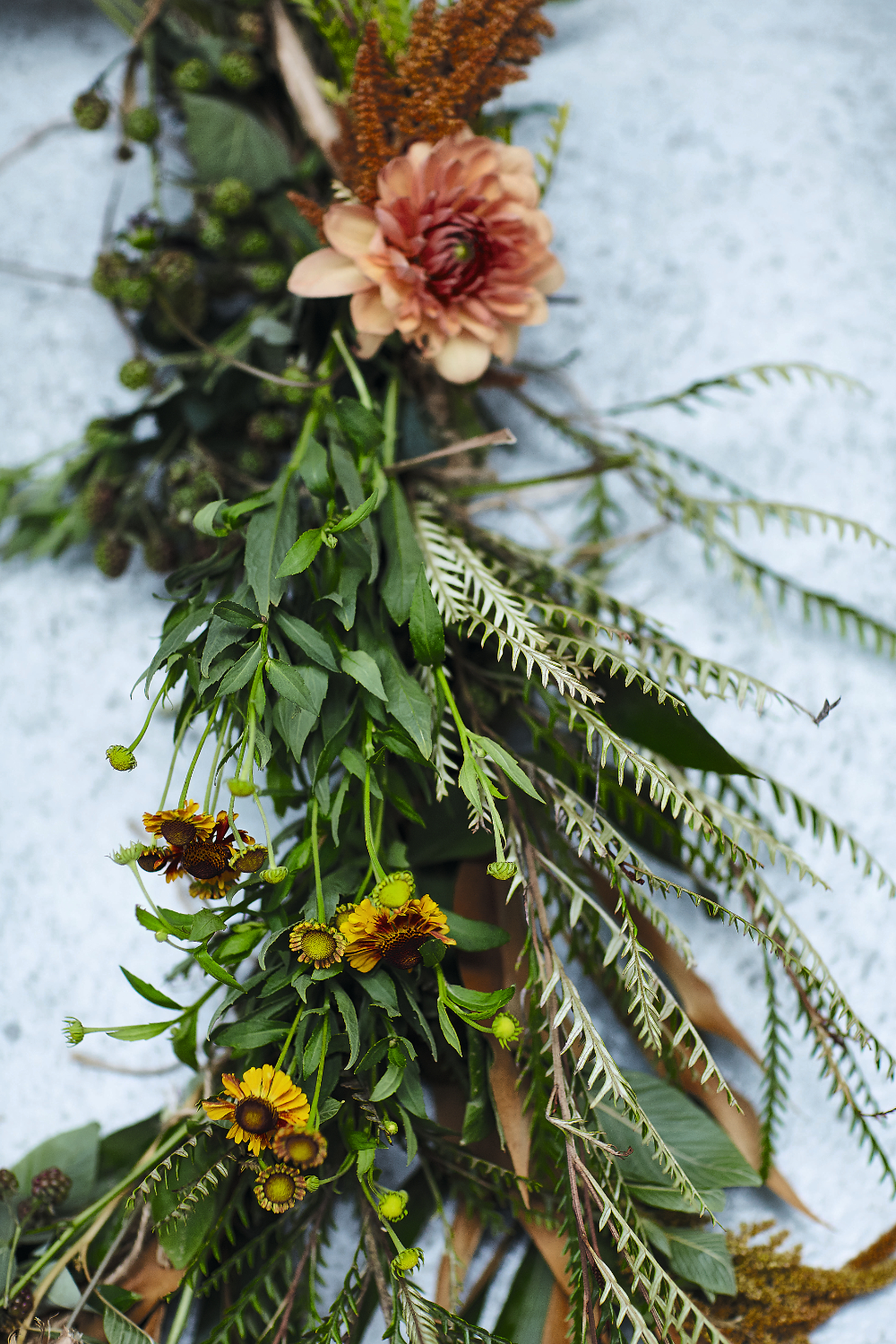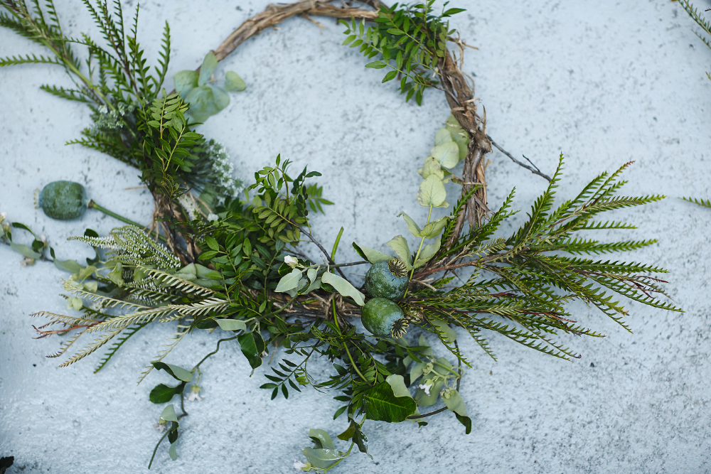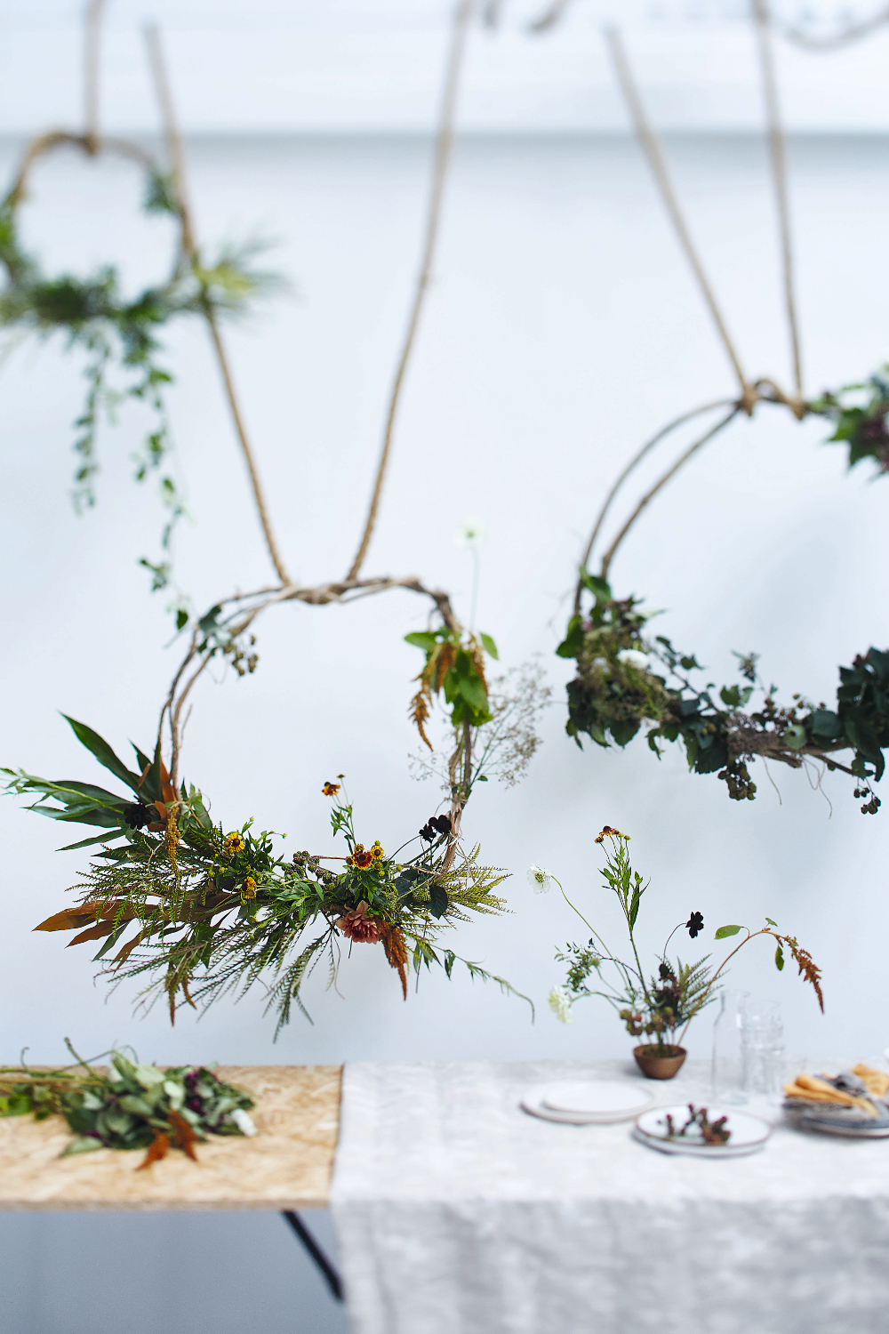 Die Bitte, eine große, möglichst eindrucksvolle Blumendekoration zu kreieren, kann auch erfahrene Florist:innen vor eine Herausforderung stellen. Doch wie immer suchen wir [Katie Smyth und Terri Chandler] auch in solchen Fällen nach einer möglichst unkomplizierten Lösung. Ein großes Arrangement aus Blumen und Zweigen lässt sich am einfachsten herstellen, wenn man es aus mehreren kleinen Teilen zusammensetzt. Das liegt daran, dass man die Teile auf relativ beengtem Raum anfertigen kann und sie im Allgemeinen leichter zu transportieren, auf- und wieder abzubauen sind. Hängender Raumschmuck wirkt besonders interessant, wenn die Objekte in unterschiedlichen Höhen schweben. Sehr effektvoll ist dies in Räumen mit hohen Decken und freigelegten Balken, an denen sich mehrere Kränze aufhängen lassen, die insgesamt eine beeindruckende Kulisse schaffen. Wenn Ihnen die Fläche für eine solch ausladende Installation fehlt, reduzieren Sie einfach die Zahl der Einzelobjekte, oder gestalten Sie diese dem vorhandenen Platz entsprechend in kleinerem Format. Das ist das Tolle an diesem Projekt: Von der Miniversion für eine kleine Runde, die sich in der Küche trifft, bis zur XXL-Version für eine Hochzeit oder einen anderen festlichen Anlass ist alles möglich. Für unsere am Seil schwebenden Kränze haben wir Zweige und frische Blumen verwendet, die schnell welken, aber Sie können genauso gut mit getrockneten oder länger haltbaren Pflanzen arbeiten. Wenn Sie es bunt mögen, wählen Sie zum Aufhängen farblich passende Schmuckbänder – vor allem, wenn es sich um relativ kleine Kränze handelt.
