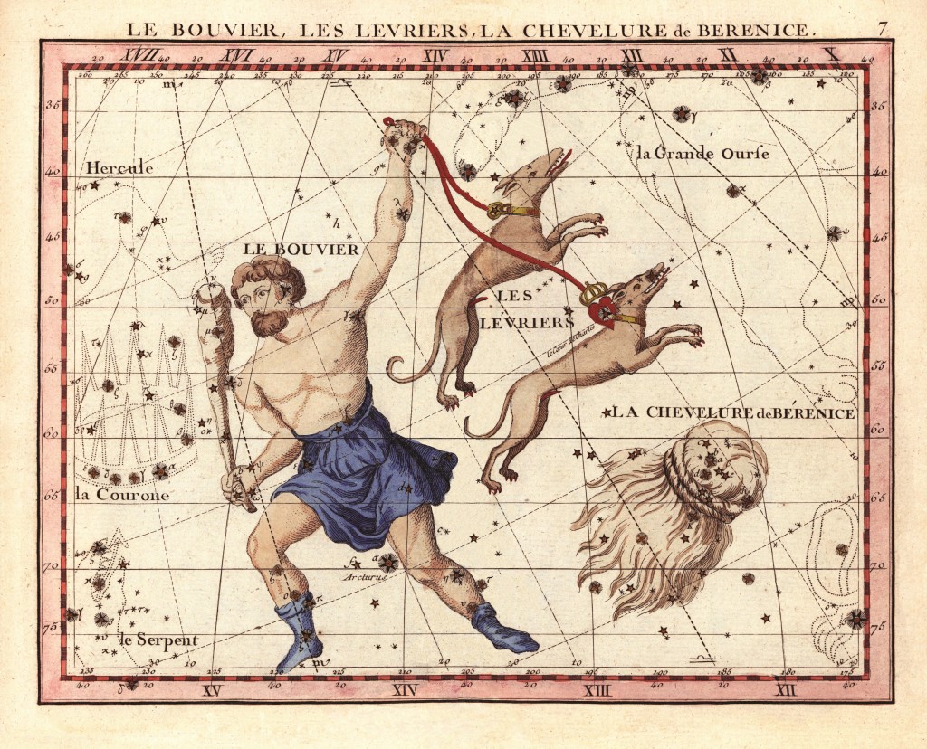 Eine Karte mit den Sternbildern Bootes (Bärenhüter), Canes Venatici (Jagdhunde) und Coma Berenices (Haar der Berenike) aus einer Ende des 17. Jh. publizierten französischsprachigen Ausgabe des Atlas. ©Album-Alamy Stock Photo