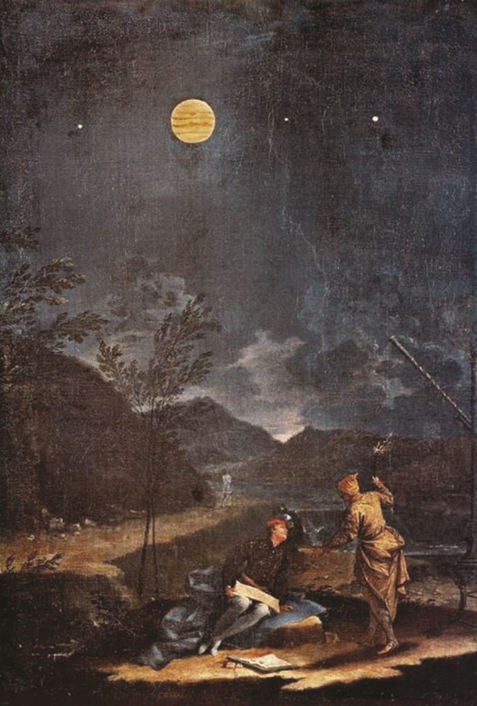 Dieses Gemälde des italienischen Malers Donato Creti aus dem Jahr 1711 zeigt Astronomen bei der Observation des Jupiters. Der Planet und drei seiner Monde sind so dargestellt, wie sie bei der Betrachtung durch ein Teleskop erscheinen würden. ©The Picture Art Collection-Alamy Stock Photo