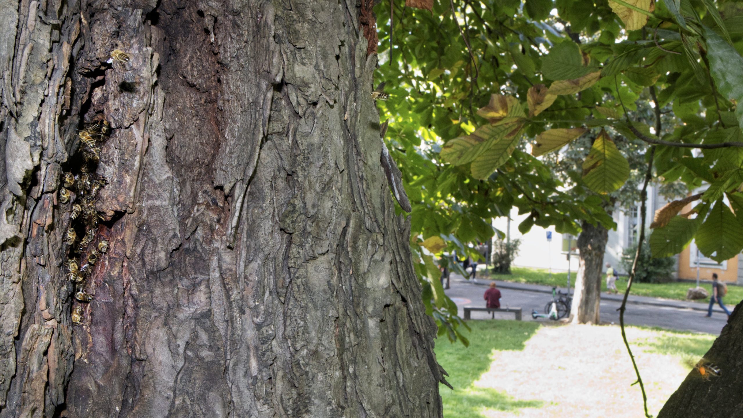Fluglochspalt zur Bienenwohnung in einer alten Kastanie in der Bonner Innenstadt