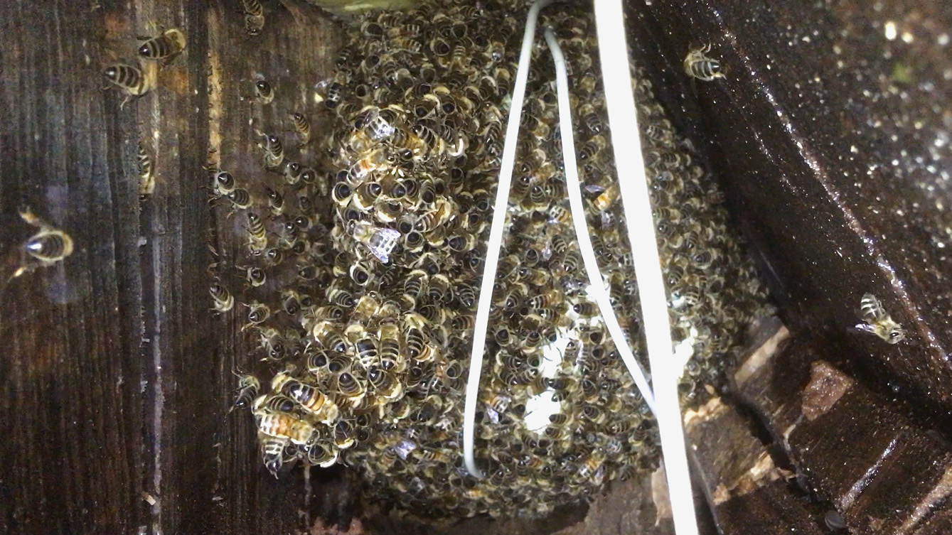 Wabenbau eines noch jungen Bienenvolks in einem Zeidelbaum mit verbauten Sensoren (Overath, 2018), Blick von unten