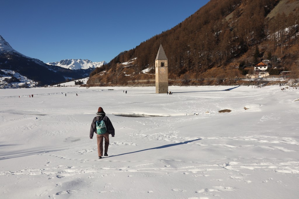 Wohl keine menschliche Erfindung drückt dermaßen umfassend die Macht über die materielle Welt aus wie ein Staudamm. Hier am Beispiel des gefrorenen Reschensees in Südtirol: Ein Stausee, der das Dorf Graun flutete. Nur noch der herausragende Kirchturm erinnert an dessen Geschichte.