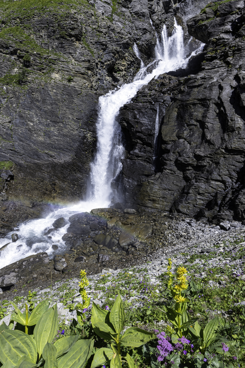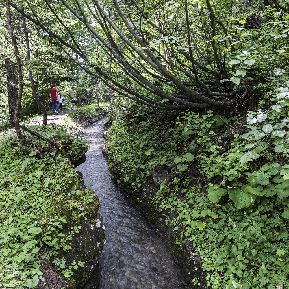 Im Sommer säumen rosafarbene Orchideen, hellblaue Glockenblumen und viele andere Blütenpflanzen den abwechslungsreichen Weg. Mehrmals überqueren wir steile Runsen, durch die, nach Starkniederschlägen oder bei intensiver Schneeschmelze, Murgänge niedergehen. An einem schönen Sommertag sind davon allerdings nur die grobblockigen Schuttablagerungen zu sehen.
