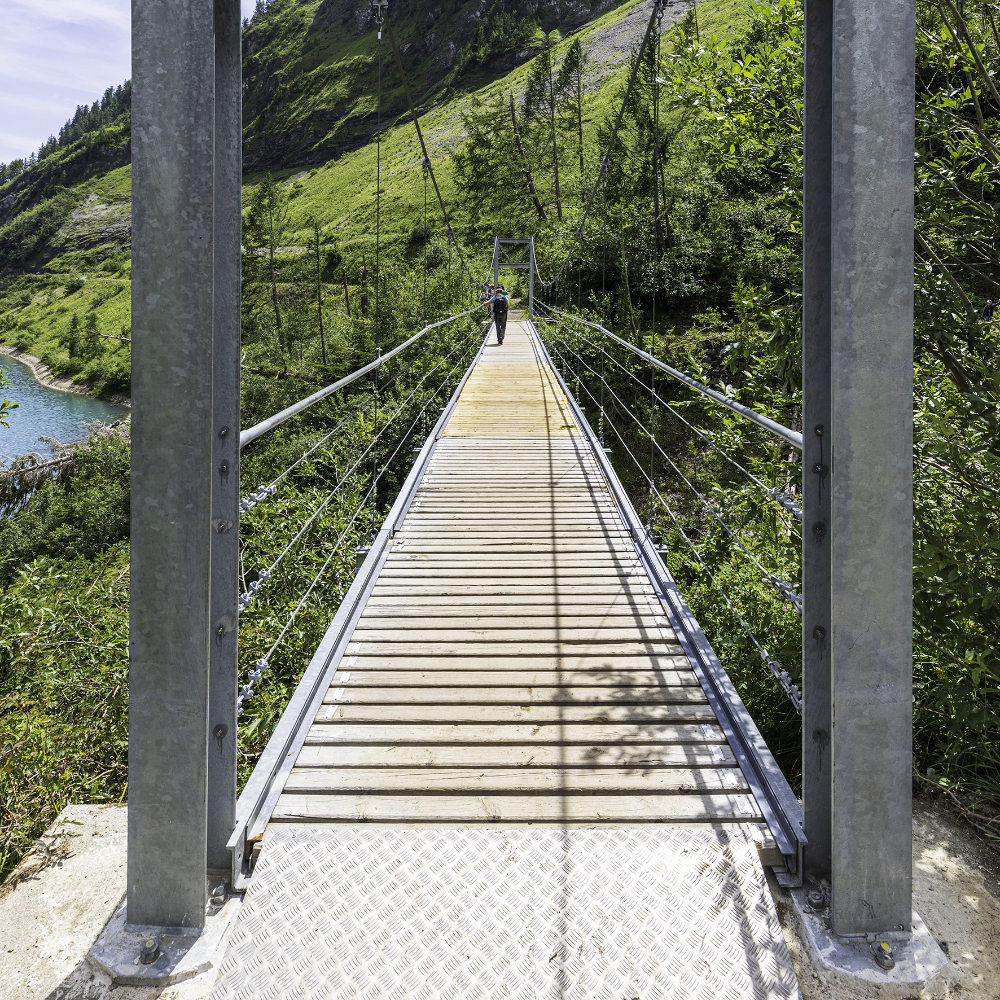 Nach einer markanten Rechtskurve kommen wir zu zwei Bergbächen, welche die Bisse jeweils durch eine Galerie unterquert, während wir die größere Runse auf einer eleganten Hängebrücke überqueren. Es folgt ein Wegabschnitt durch offenes Gelände mit besonders reicher Alpenflora. Rosarote Schmalblättrige Weidenröschen (Epilobium angustifolium) kontrastieren mit dem türkisfarbenen See. Schließlich mündet der Wanderweg in die Fahrstraße von der Staumauer zur Alp von Lourantse.