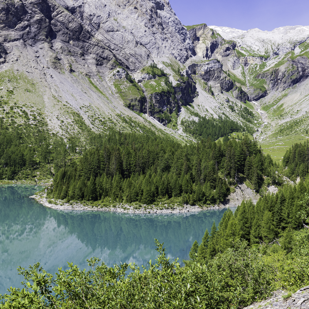 Auf dem rund 1800 m.ü.M. verlaufenden Bergwanderweg befinden wir uns rund 300 Höhenmeter unterhalb der lokalen Waldgrenze. Allerdings ist das Gelände so steil, dass Lawinen den aufkommenden Baumbestand immer wieder zerstören. Deshalb gibt es nur an geschützten Stellen bewaldete Partien. So haben wir meist eine gute Aussicht auf den See und bei Windstille auch auf die schönen Spiegelungen der gegenüberliegenden Berggipfel.