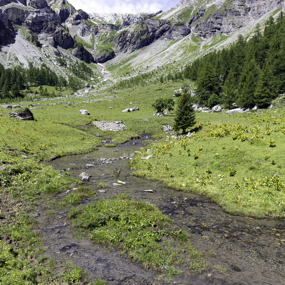 Der Weg westwärts über die Alp Lourantse verläuft zunächst etwa parallel zum Bach. Wo er sich von diesem wieder entfernt, lohnt sich der kleine Abstecher nach rechts zu mehreren Quellen im flachen, offenen Gelände. Anschließend geht es weiter bis zu einer weiteren Brücke über die Liène.