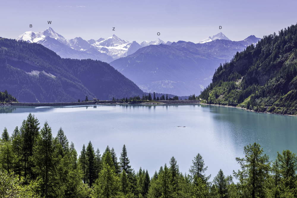 Bishorn (B), Weisshorn (W), Zinalrothorn (Z), Obergabelhorn (O), Dent Blanche (D)