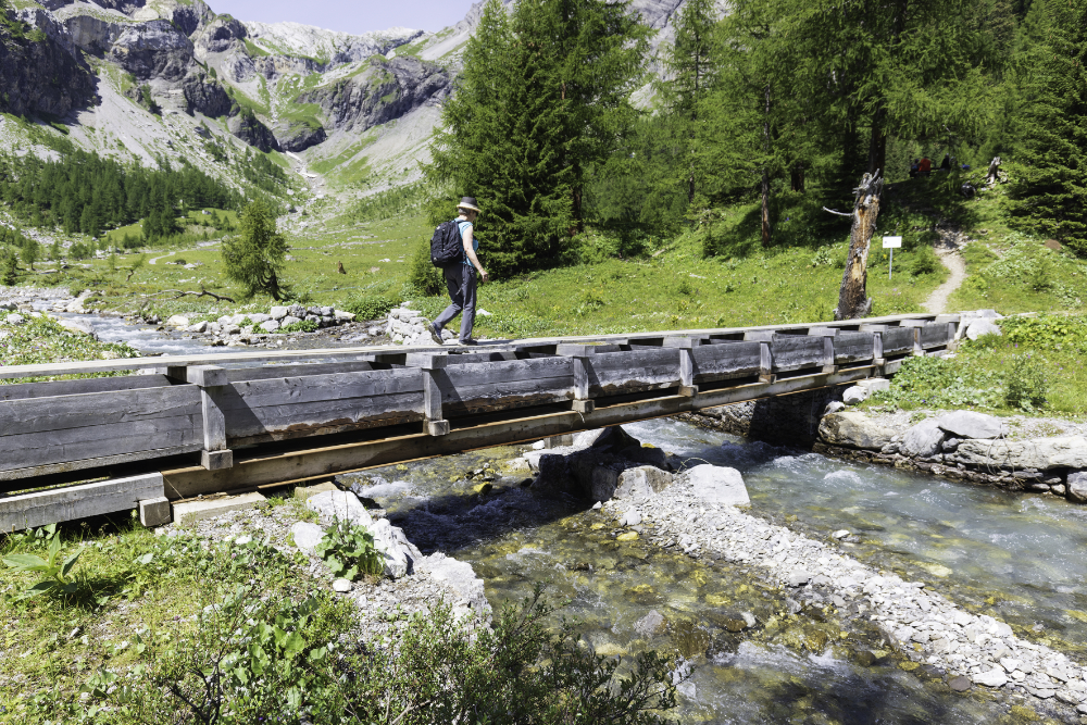 Vom Gîte folgen wir nicht dem Sträßchen Richtung Süden, sondern gehen zunächst über die Moräne Richtung Osten und biegen bei der Wegverzweigung nach rechts unten ab, wo wir wieder auf die Bisse de Sion stoßen. Dieser folgen wir durch einen Wald, der ebenfalls von Lawinenniedergängen stark in Mitleidenschaft gezogen wurde. Während Lärchen und andere Nadelbäume wie Streichhölzer geknickt wurden, überstanden Grün-Erlen die Lawinen mit ihrer ganz eigenen Strategie. Das Holz der Grün-Erlen ist dermaßen weich und biegsam, dass sie sich bei Schnee-Auflast ohne zu brechen flach auf den Boden legen und später unbeschadet wieder aufrichten können.